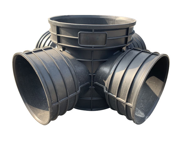 塑料檢查井的井座部分大多采用的是一次性注塑成型,以異徑接頭、變角接頭和橡膠密封圈等配件來達到改變管徑及角度的連接。塑料檢查井配套開發(fā)了井蓋、井筒和相關配件,路面載荷通過井蓋、井座作用于檢查井周圍,避免了路面載荷對檢查井的破壞。井座具有上下浮動的功能,可主動適應路面的高低變化,同時井筒采用專用井筒,可根據(jù)現(xiàn)場埋設深度截取相應長度,靈活方便。井筒、進(出)水管道與井座的連接采用橡膠密封圈柔性承插式連接或者是熱收縮套連接,可適應小范圍內的角度變化,施工方便快捷,密封性能好、防滲漏,有效防止對地下水的二次污染,是一種環(huán)保節(jié)能建材。